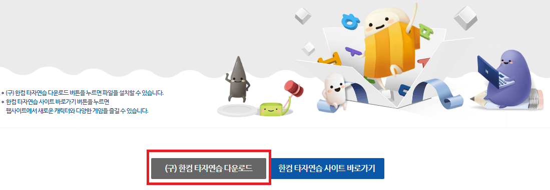 왼쪽 아래에 (구) 한컴 타자연습 다운로드 버튼을 클릭하시면, 한컴타자연습을 다운로드 받으실 수 있습니다. 다운로드 후에 설치하시면 바로 이용가능합니다.